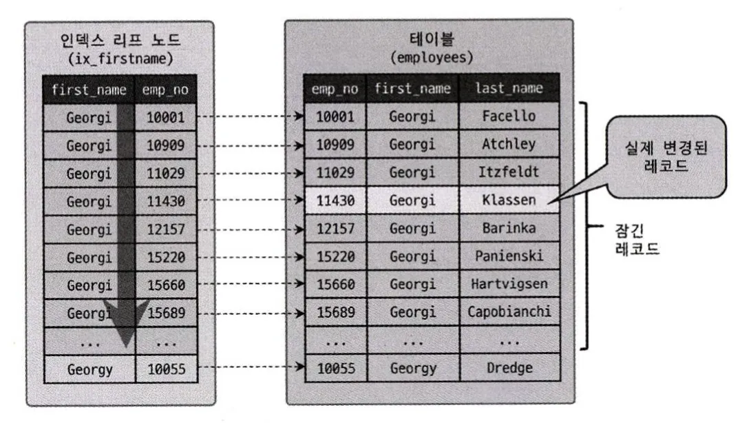인덱스는 성(last_name)으로만 구성되어 있기 때문에, 해당 레코드를 갱신하기 위해서는 인덱스를 통해 검색되는 모든 레코드에 잠금을 걸게 된다.