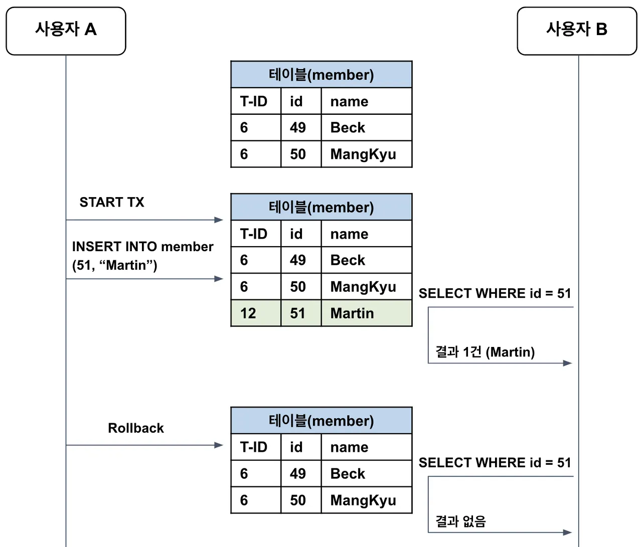 이렇듯 어떤 트랜잭션의 작업이 완료되지 않았는데도, 다른 트랜잭션에서 볼 수 있는 부정합 문제를 Dirty Read(오손 읽기)라고 한다. Dirty Read는 데이터가 조회되었다가 사라지는 현상을 초래하므로 시스템에 상당한 혼란을 주게 된다. 만약 위의 경우에 사용자 A가 커밋이 아닌 롤백을 수행한다면 어떻게 될까?