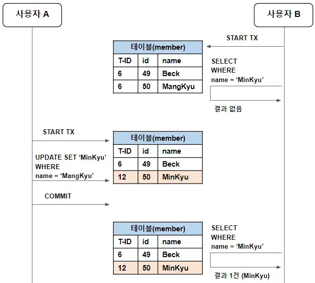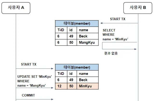 하지만 READ COMMITTED는 Non-Repeatable Read(반복 읽기 불가능) 문제가 발생할 수 있다. 예를 들어 사용자 B가 트랜잭션을 시작하고 name = “Minkyu”인 레코드를 조회했다고 하자. 해당 조건을 만족하는 레코드는 아직 존재하지 않으므로 아무 것도 반환되지 않는다.