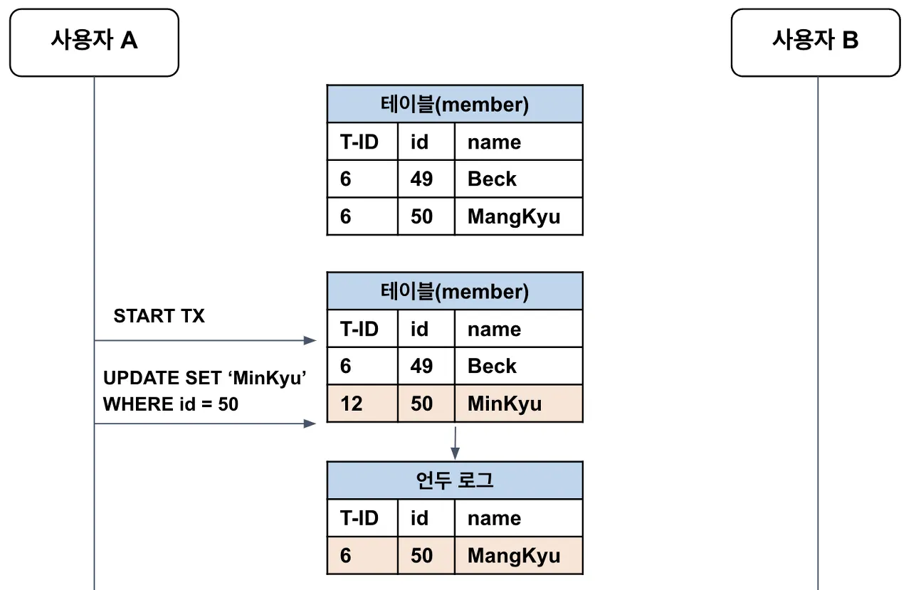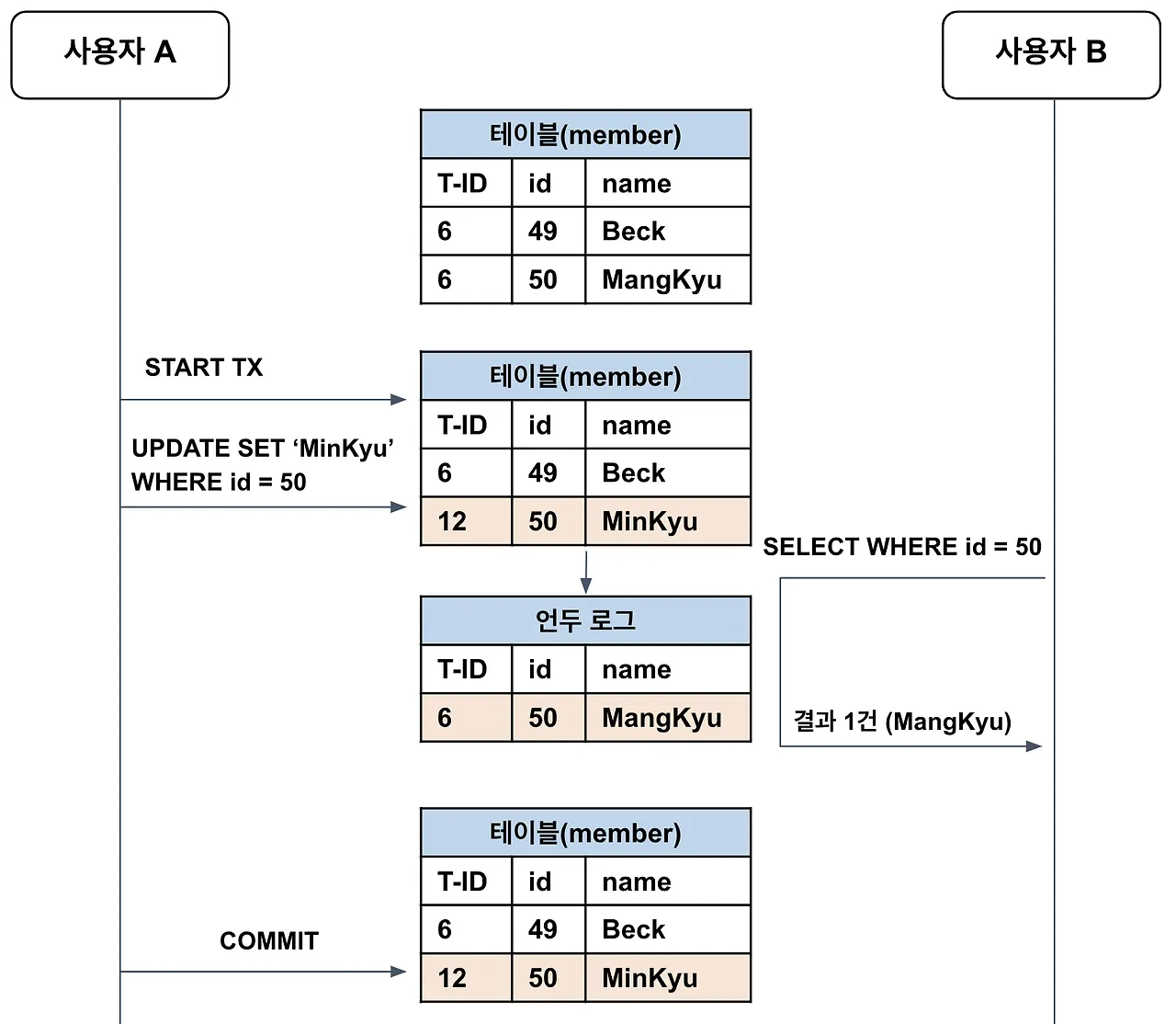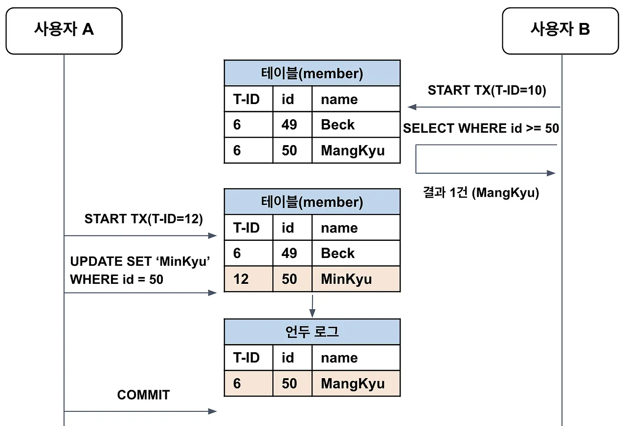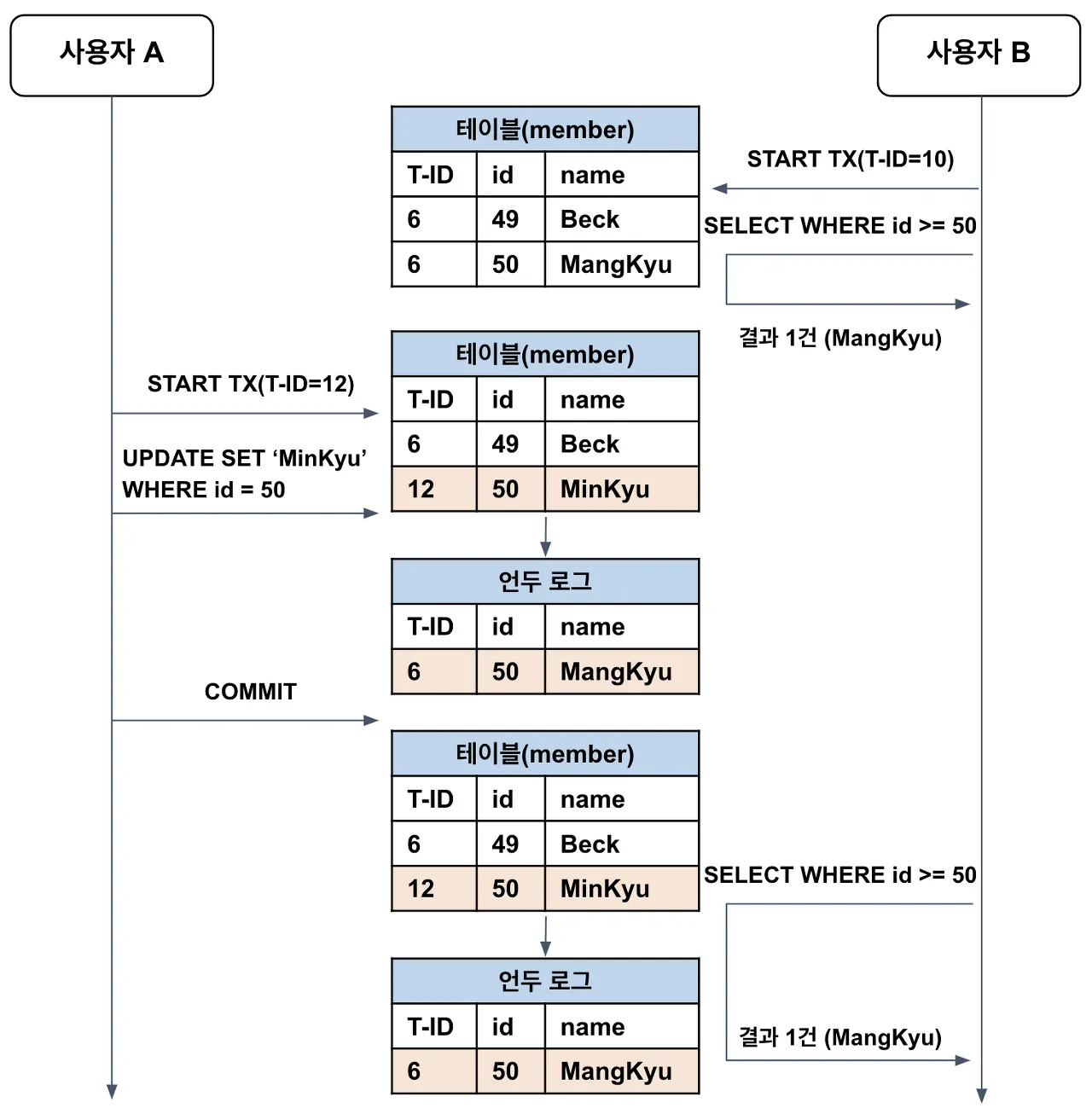 만약 테이블에 자신보다 이후에 실행된 트랜잭션의 데이터가 존재한다면 언두 로그를 참고해서 데이터를 조회한다. 따라서 사용자 A의 트랜잭션이 시작되고 커밋까지 되었지만, 해당 트랜잭션(12)는 현재 트랜잭션(10)보다 나중에 실행되었기 때문에 조회 결과로 기존과 동일한 데이터를 얻게 된다.
