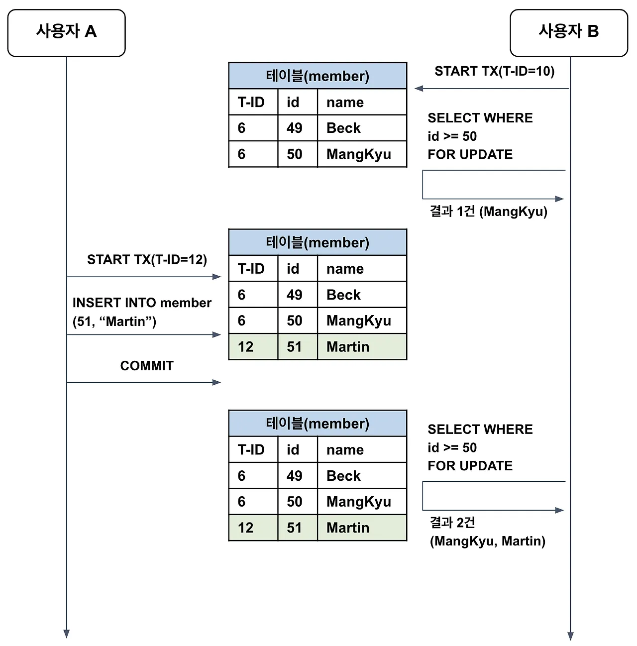 이때 사용자 B가 동일한 쓰기 잠금 쿼리로 다시 한번 데이터를 조회하면, 이번에는 2건의 데이터가 조회된다. 동일한 트랜잭션 내에서도 새로운 레코드가 추가되는 경우에 조회 결과가 달라지는데, 이렇듯 다른 트랜젹션에서 수행한 작업에 의해 레코드가 안보였다 보였다 하는 현상을 Phantom Read(유령 읽기)라고 한다. 이는 다른 트랜잭션에서 새로운 레코드를 추가하거나 삭제하는 경우 발생할 수 있다.