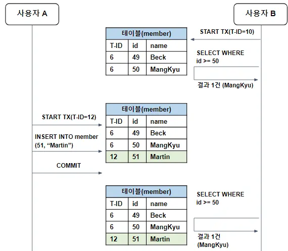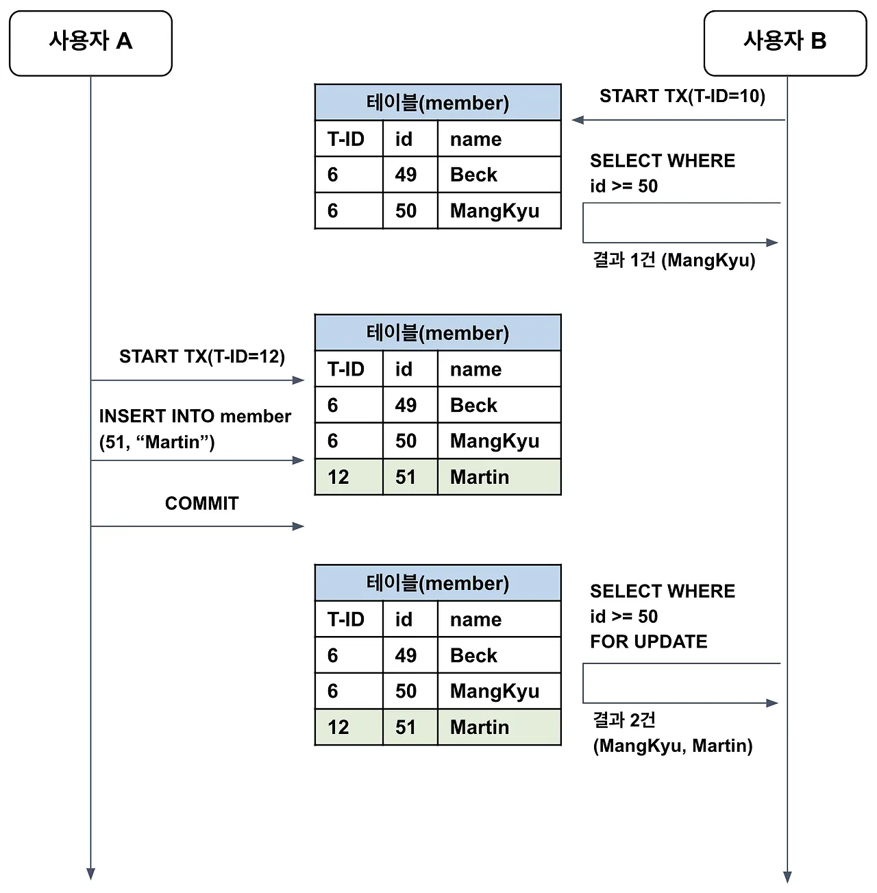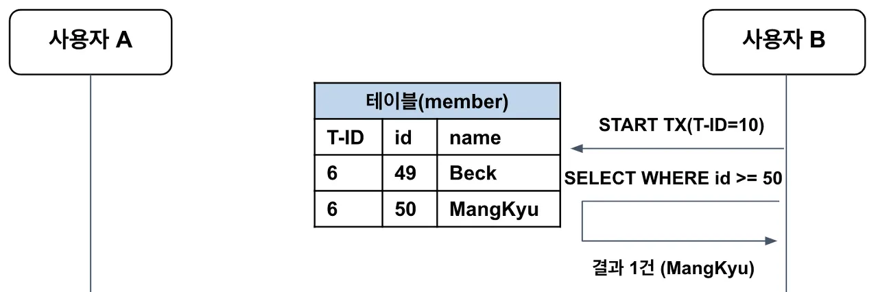 사용자 B는 트랜잭션을 시작하고, 잠금없는 SELECT 문으로 데이터를 조회하였다. 그리고 사용자 A는 INSERT 문을 사용해 데이터를 추가하였다. 이때 잠금이 없으므로 바로 COMMIT 된다. 하지만 사용자 B가 SELECT FOR UPDATE로 조회를 했다면, 언두 로그가 아닌 테이블로부터 레코드를 조회하므로 Phantom Read가 발생한다