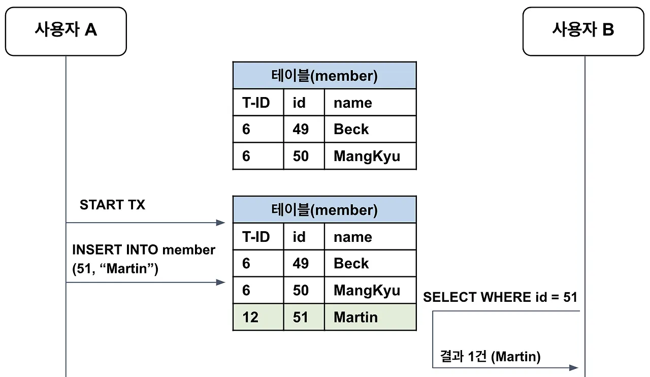 하지만 MVCC 덕분에 일반적인 조회에서 유령 읽기(Phantom Read)는 발생하지 않는다. 왜냐하면 자신보다 나중에 실행된 트랜잭션이 추가한 레코드는 무시하면 되기 때문이다. 이러한 상황을 그림으로 표현하면 다음과 같다.