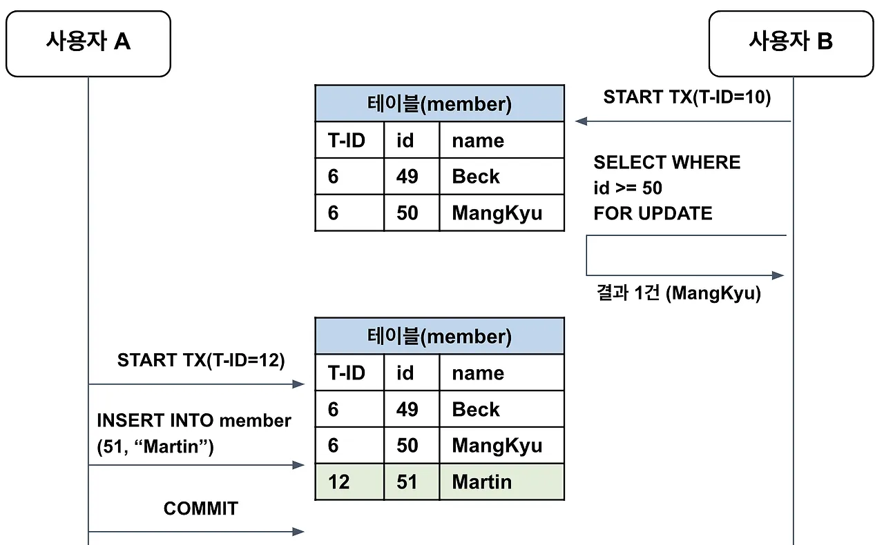 하지만 MySQL에는 갭 락이 존재하기 때문에 위의 상황에서 문제가 발생하지 않는다. 사용자 B가 SELECT FOR UPDATE로 데이터를 조회한 경우에 MySQL은 id가 50인 레코드에는 레코드 락, id가 50보다 큰 범위에는 갭 락으로 넥스트 키 락을 건다.