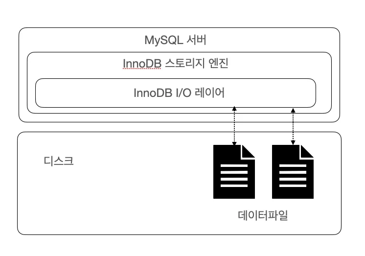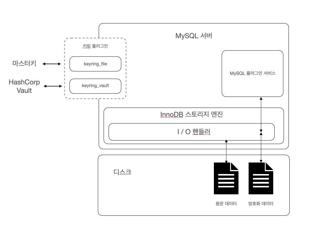 MySQL 암호화 기능은 데이터베이스 서버와 디스크 사이의 데이터를 읽고 쓰기 지점에서 암호화 또는 복호화를 수행한다. 즉 InnoDB 스토리지 엔진의 I/O 레이어에서만 데이터의 암호화 복호화 과정이 실행된다는 뜻이다.