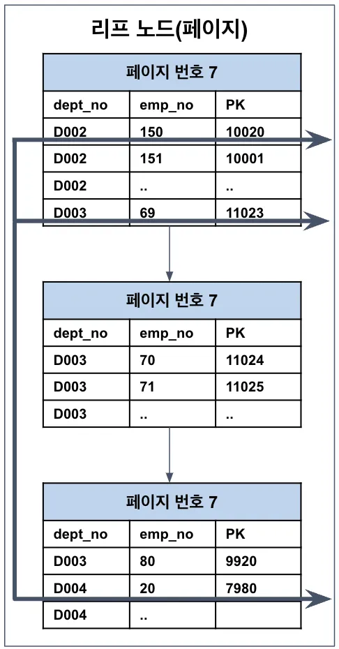 인덱스의 선행 칼럼인 dept_no 조건 없이 emp_no 값으로만 검색하면 인덱스를 효율적으로 사용할 수 없다.