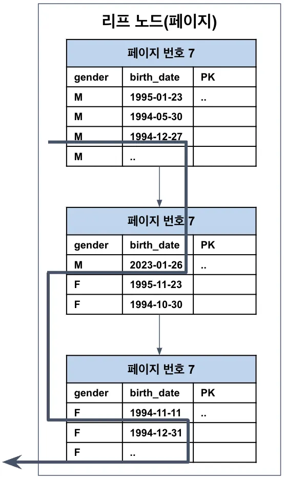 위의 이유 때문에 InnoDB는 인덱스에 저장되어 있는 프라이머리 키 값을 이용해 프라이머리 키 인덱스를 한 번 더 검색한 후, 프라이머리 키 인덱스의 리프 페이지에 저장되어 있는 레코드를 읽는다.