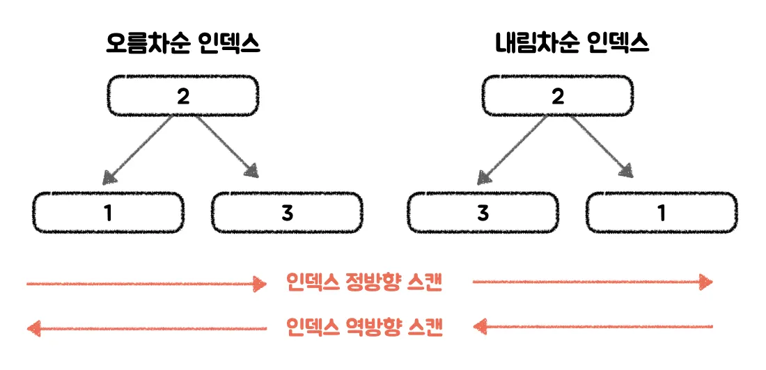 즉, 인덱스 생성 시점에 오름차순 또는 내림차순으로 정렬이 결정되지만 쿼리가 인덱스를 사용하는 시점에 인덱스를 읽는 방향에 따라 오름차순(ASC) 또는 내림차순(DESC) 정렬 효과를 얻을 수 있다.