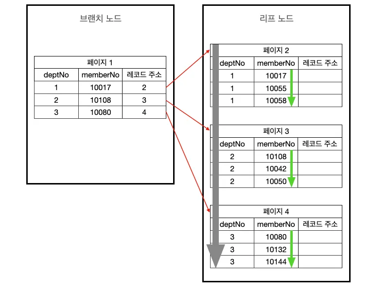 아래 그림에서 중요한 것은 인덱스의 두 번째 컬럼은 첫 번째 컬럼에 의존해서 정렬되어 있다는 것이다. 즉 두 번째 컬럼의 정렬은 첫 번째 컬럼이 똑같은 레코드에서만 의미가 있다는 것이다. 그림에서는 컬럼이 2개 뿐이지만, 만약 컬럼이 4개인 인덱스를 생성한다면 세 번째 컬럼은 두 번째 컬럼에 의존해서 정렬되고, 네 번째 컬럼은 세 번째 컬럼에 의존해 정렬된다.