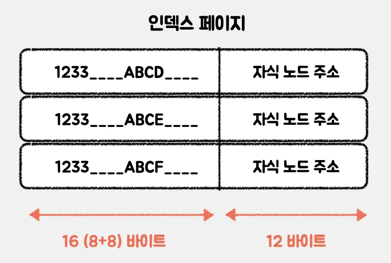 이 경우, 하나의 인덱스 페이지에는 16*1024/(16+12) = 585개의 키를 저장할 수 있다.