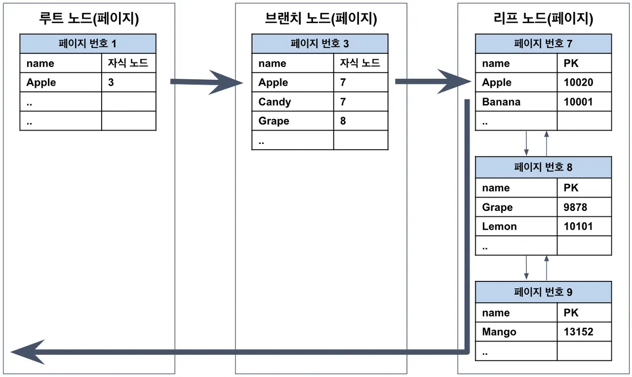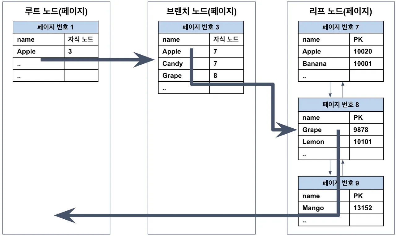 시작점을 찾았으면 이후에는 순서대로 검색 범위의 마지막 인덱스(Mango)까지 읽으면 되는데, 이를 스캔이라고 한다. 이것이 가능한 이유는 인덱스가 정렬되어 있기 때문이며, 스캔을 하다가 페이지의 끝에 도달하면 페이지 간의 링크를 이용해 다음 페이지(9)로 넘어간다. 그리고 계속해서 스캔하다가 마지막 인덱스를 찾으면 지금까지 읽은 레코드를 반환하고 쿼리를 종료한다.