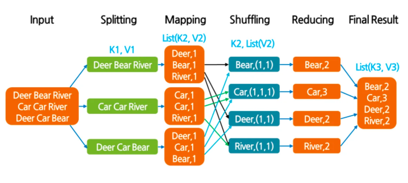 셔플(Shuffle and sort) 단계: 맵 단계에서 나온 중간 경과를 해당 리듀스 함수에 전달하는 단계