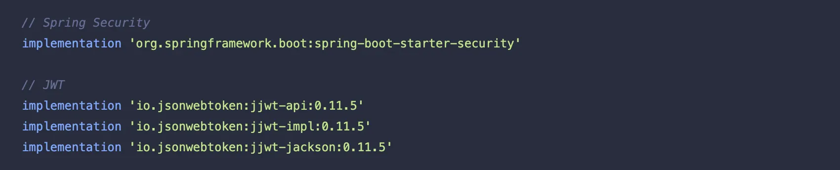 Spring Security, JWT 관련 의존성들을 추가해준다.