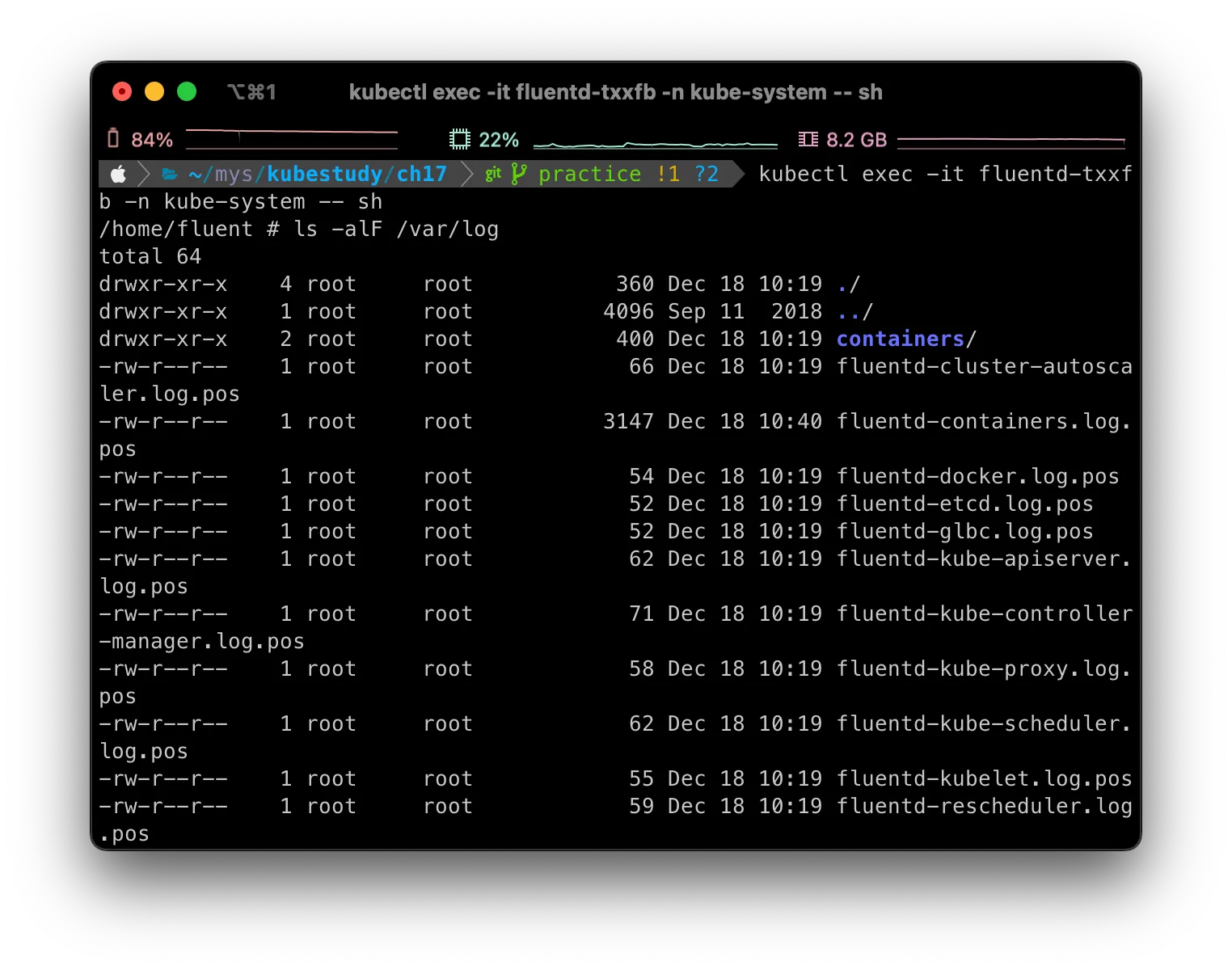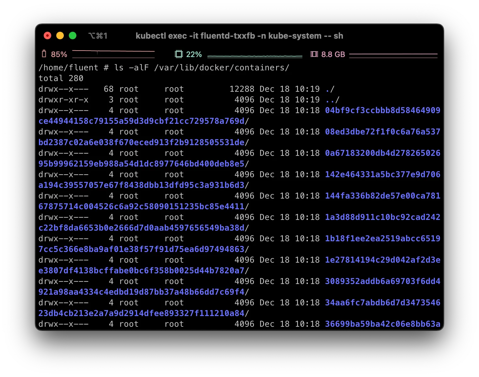 로컬이 아니라 linux vm에서 구동했을 경우 /var/log/containers 경로가 존재. 해당 부분은 나중에 실습하기로..