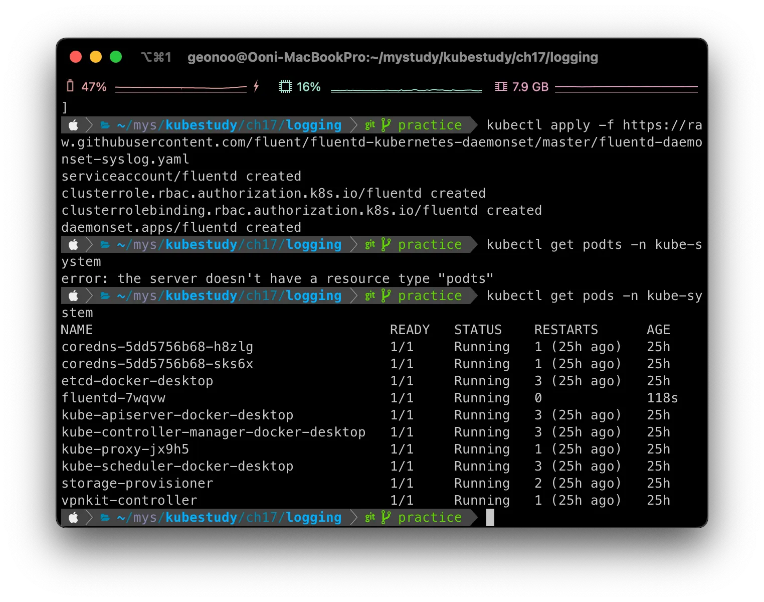 kubectl apply -f https://raw.githubusercontent.com/fluent/fluentd-kubernetes-daemonset/master/fluentd-daemonset-syslog.yaml 로 Fluentd를 설치해둔다.