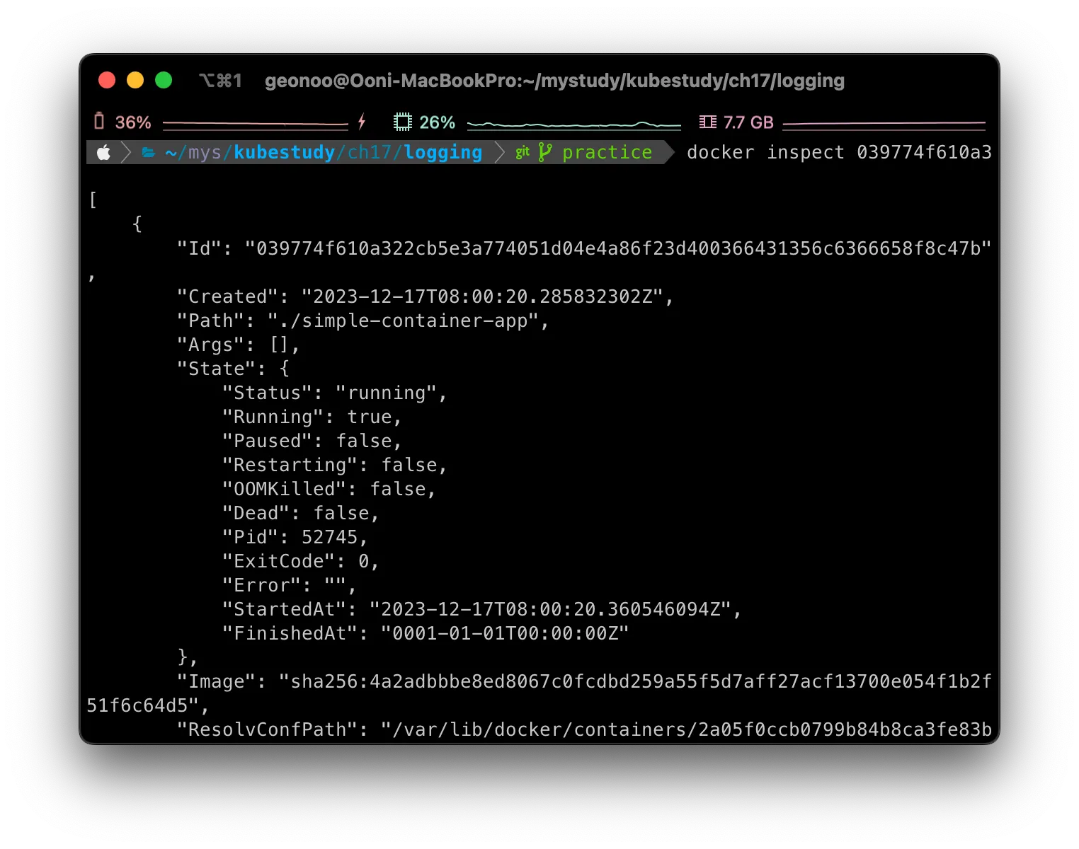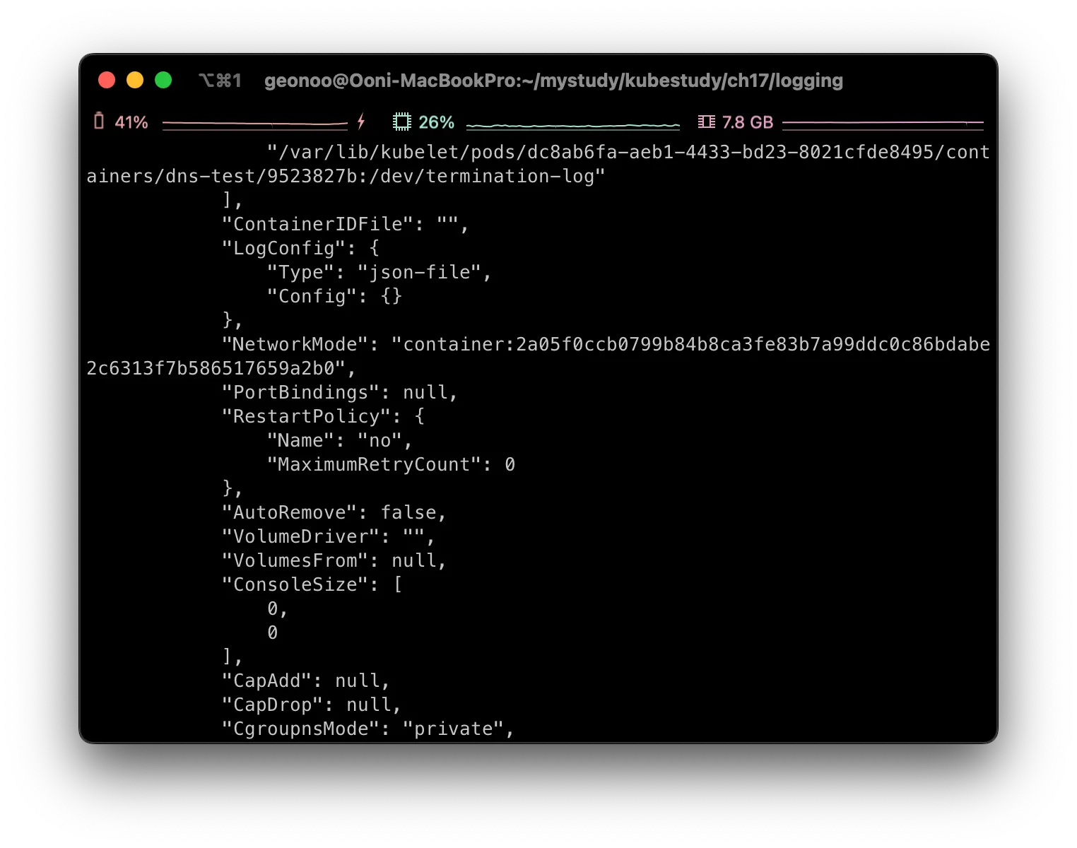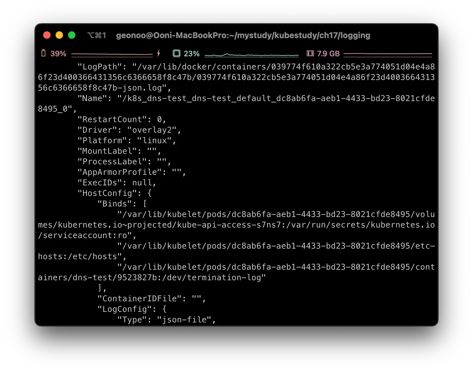 docker inspect <컨테이너ID> 명령으로 컨테이너 런타임이 로그를 어떻게 다루는지 확인한다.