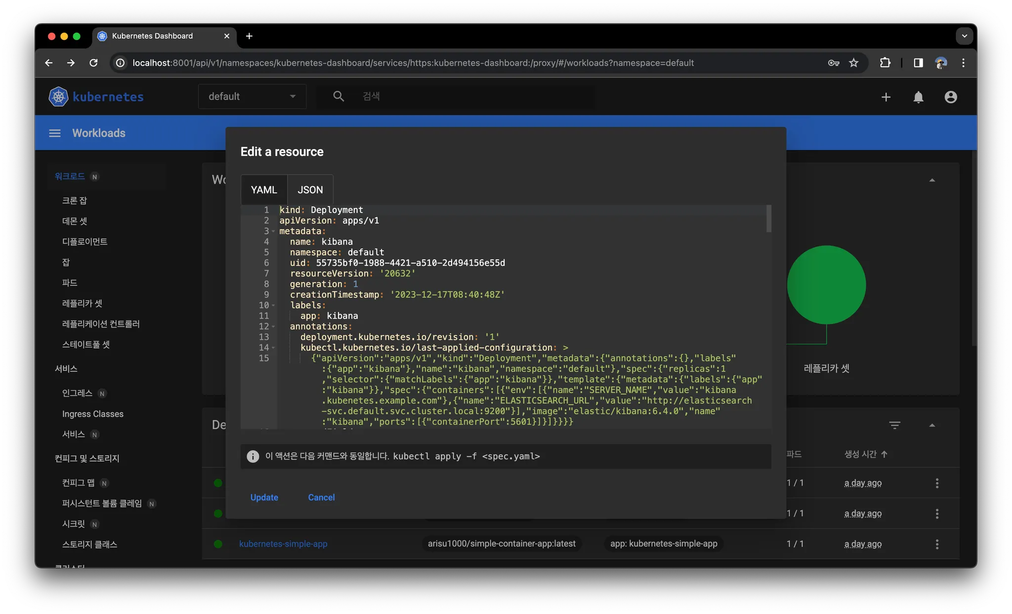 .spec.template.spec.containers[].image 필드 값은 Elasticsearch로 지정.