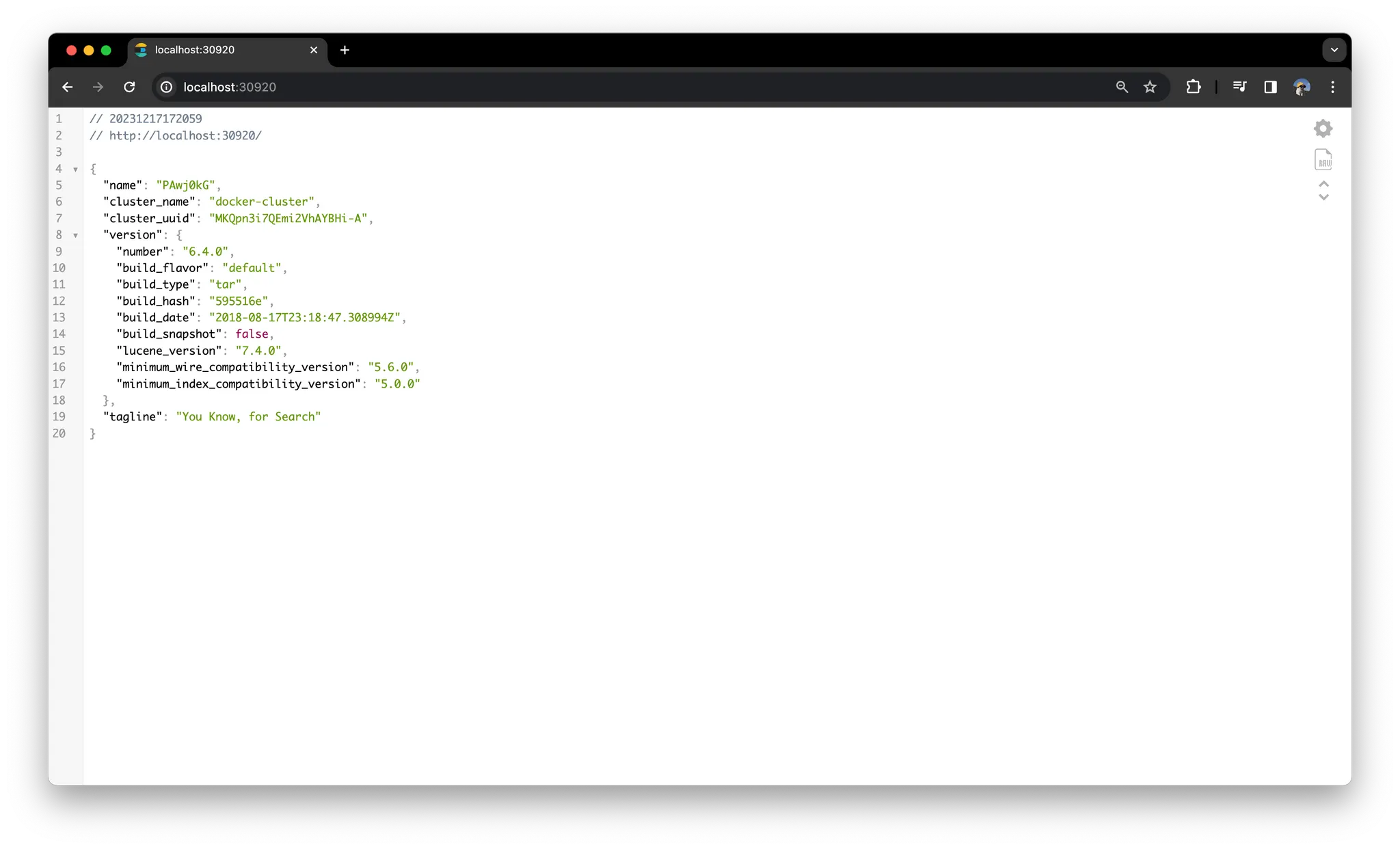 클러스터에 적용 후 30920포트로 실행시켰을 때 아래와 같이 출력되면 Elasticsearch가 정상적으로 실행된 것.