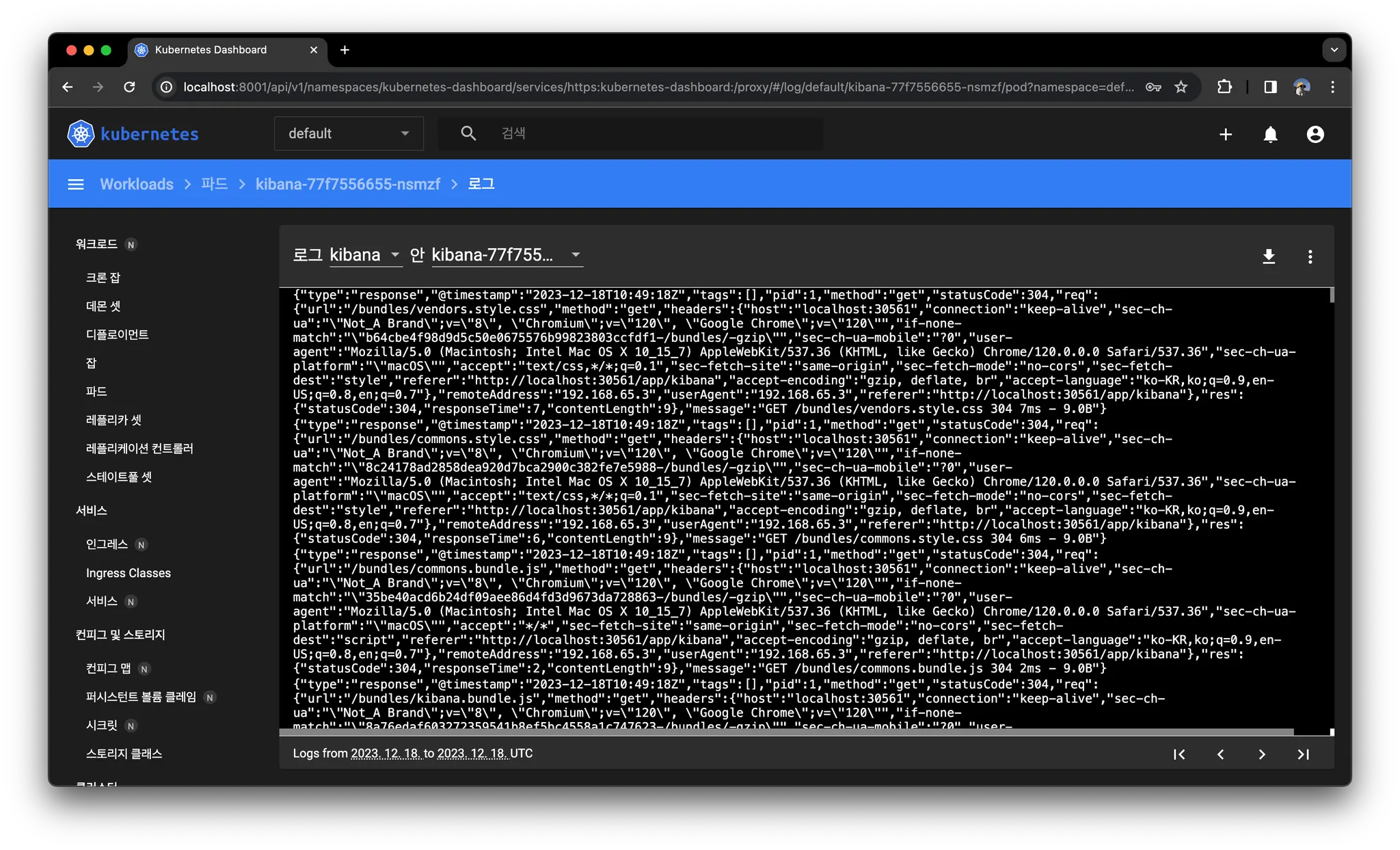쿠버네티스의 kubectl은 개별 노드에 접근하지 않고 직접 파드의 로그를 확인할 수 있다. 이때 kubectl logs -f 파드이름 명령어를 사용한다. 여기서는 앞서 실행해 두었던 kubernetes-simple-app 디플로이먼트가 생성한 파드의 로그를 확인한다.