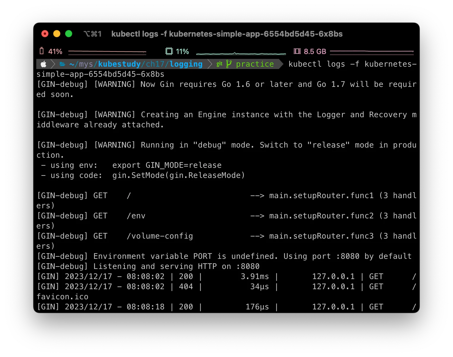 먼저 kubectl get pods 로 파드 이름을 확인한 후 kubectl port-forward pods/파드이름 8080:8080 명령으로 파드에 접근할 수 있는 포트 번호를 8080으로 설정한다. 그리고 새로운 셸을 열어 kubectl logs -f 파드이름 명령어를 실행한다.