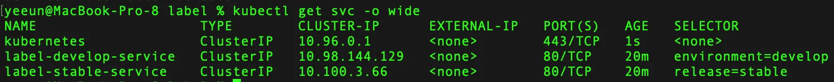 kubectl get svc -o wide : 서비스가 어떤 셀럭터를 갖고 만들어졌는지 확인