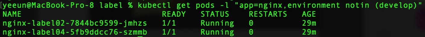 kubectl get pods -l "app=nginx,environment notin (develop)”