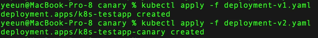 kubectl apply -f deployment-v1.yaml , kubectl apply -f deployment-v2.yaml : 버전이 다른 템플릿 2개를 클러스터에 적용해 파드 배포