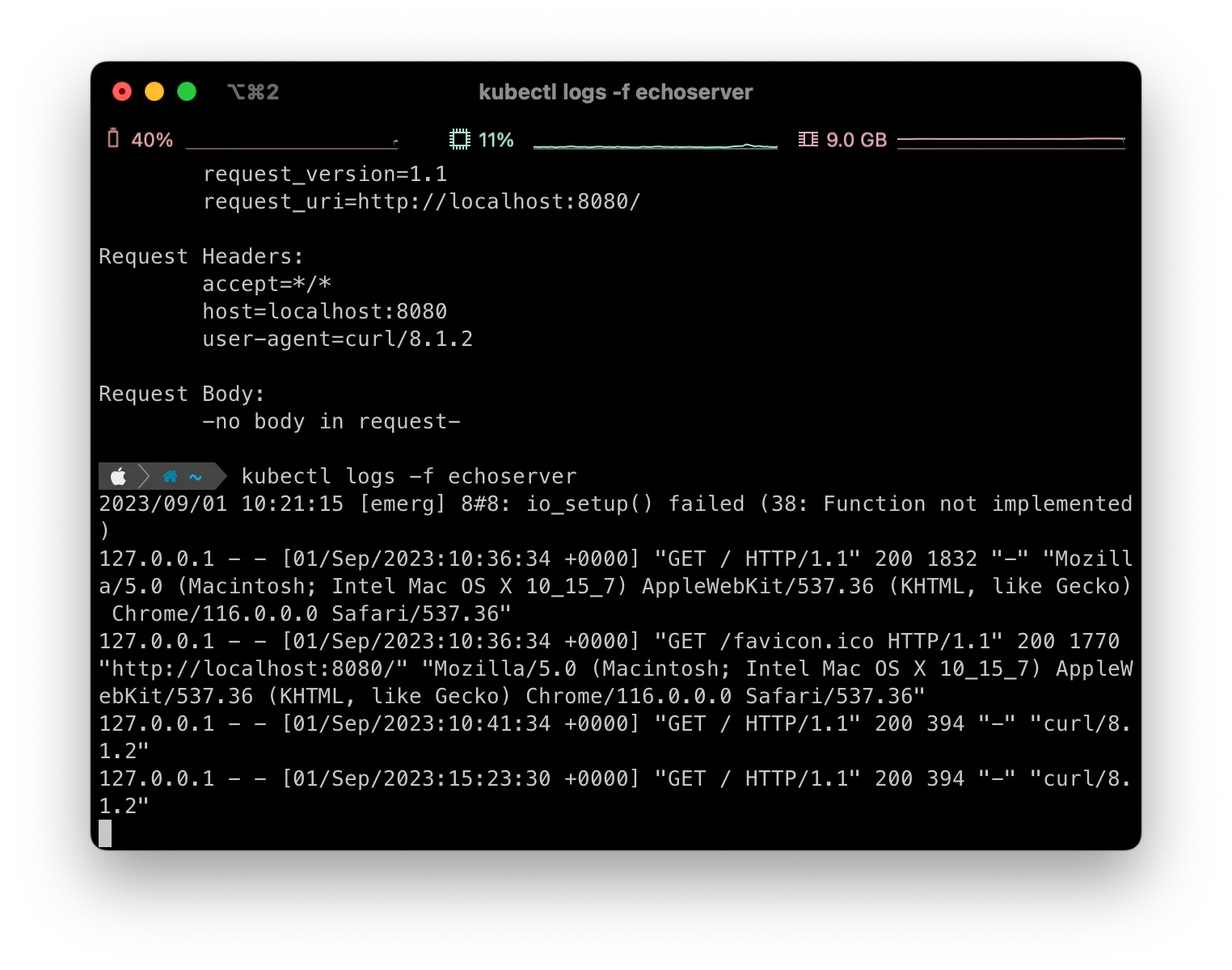 이후 에코 서버의 실행 중 로그를 수집할 때는 kubectl logs -f 파드이름 을 실행한다.