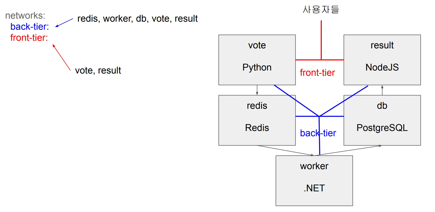 networks에 네트워크를 나열하고 네트워크를 적절하게 서비스에 지정해주어야함