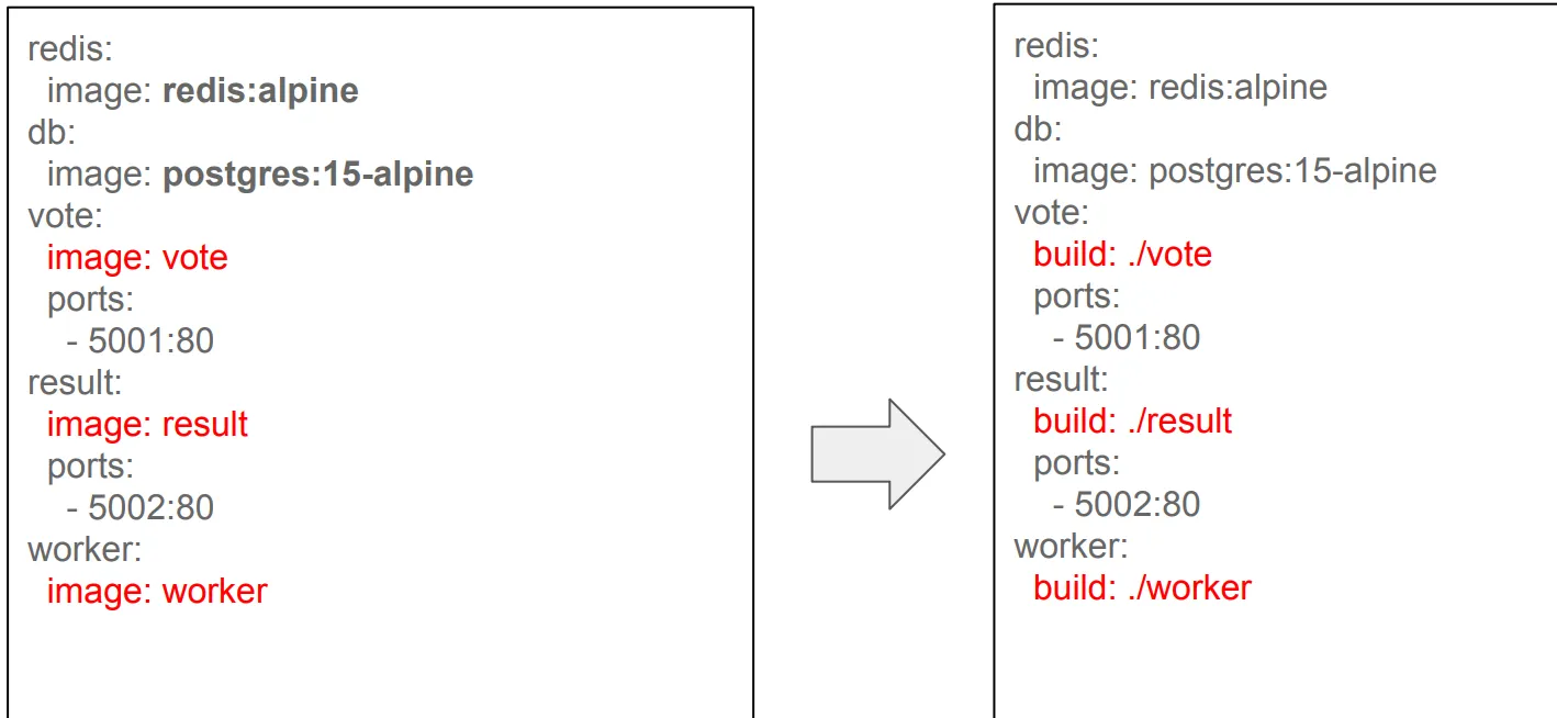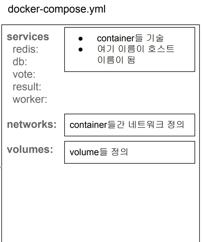 즉 각 서비스는 자신의 Dockerfile을 갖고 있어야함 아니면 docker hub등에서 이미지를 다운로드