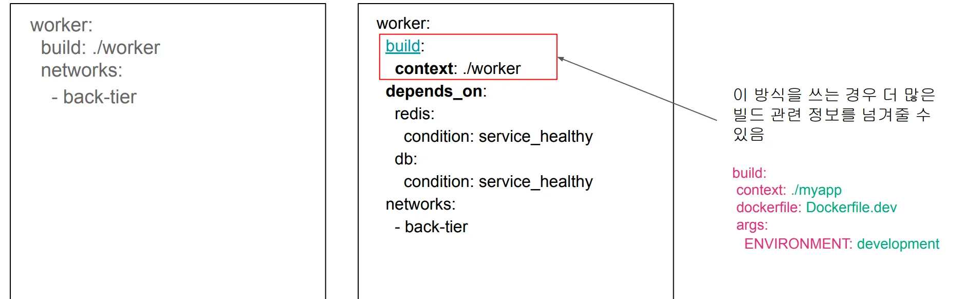 build 키워드 밑에 빌드 관련 정보를 더 남겨서 docker compose 정보들을 기록 가능