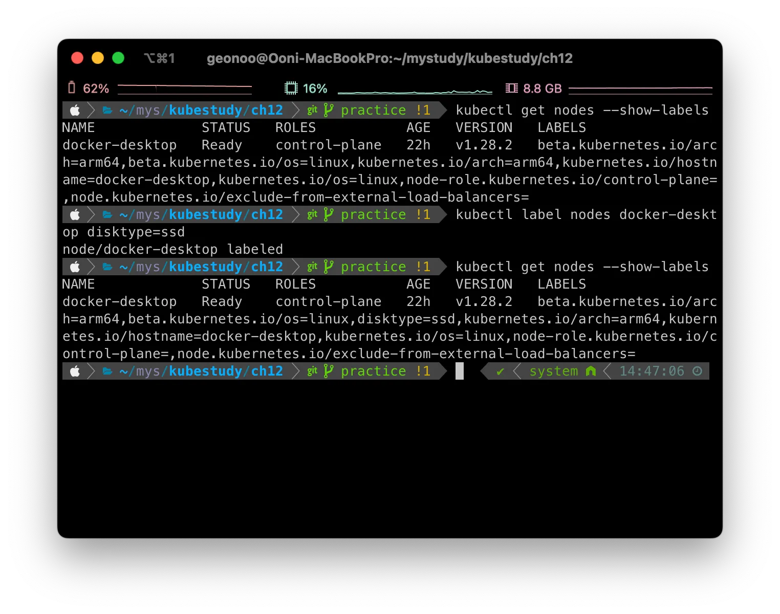위 yaml 파일을 apply 하면 파드 상태가 Pending이다. .spec.nodeSelector.disktype 필드 값 hdd는 노드 레이블의 설정인 ssd와 달라서 실행할 노드가 없기 때문이다.