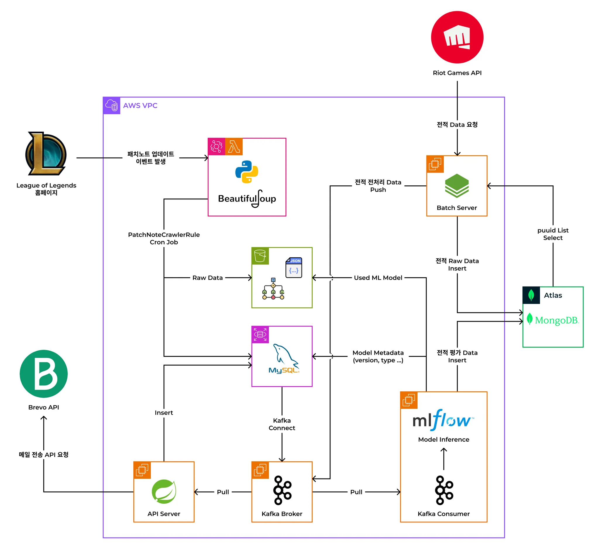 분당 100건 전적 데이터 배치 처리 후, MongoDB 적재. Kafka를 활용해 ML 모델 분석과 RDBMS로 분산 처리