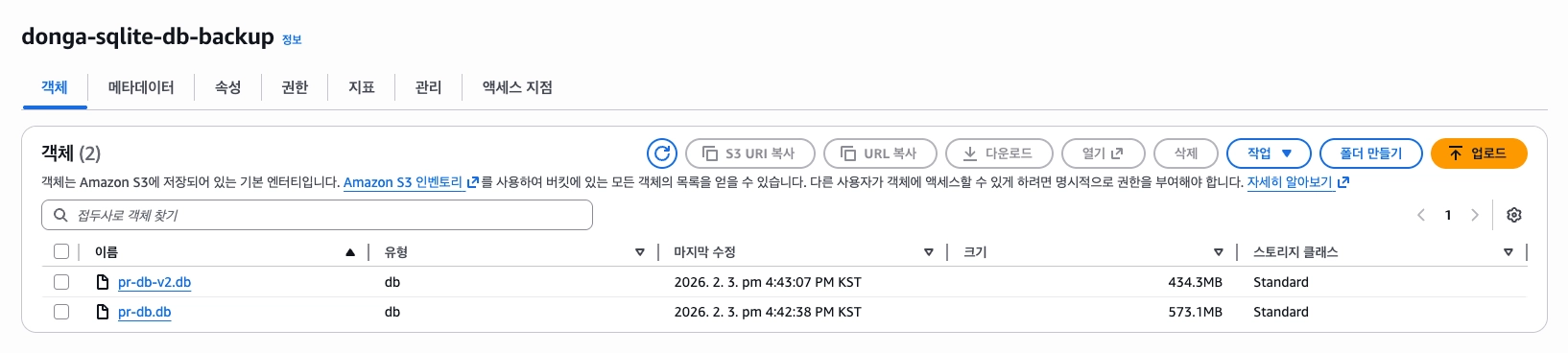 기존 sqlitedb인 pr-db.db, pr-db-v2.db S3로 백업 완료