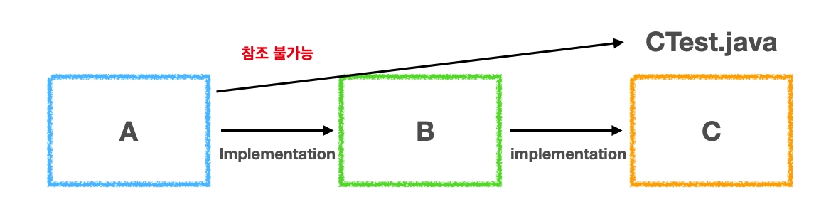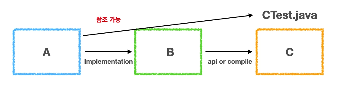 다음과 같이 Gradle에서 implementation은 해당 모듈 내부용이다. 즉, storage(B)가 빌드될 때만 JpaRepository(C)가 classpath에 있고, api(A)가 storage(B)를 가져다 쓸 때는 노출되지 않는다.
