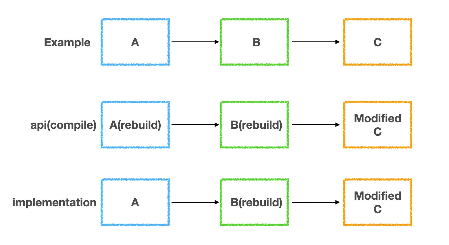 api를 사용하면 직접, 간접 의존하고 있는 모듈 모두가 rebuild(recompile)이 되어야 한다. 즉 C모듈을 수정하면 B, A 모듈까지 모두 rebuild 되어야한다.