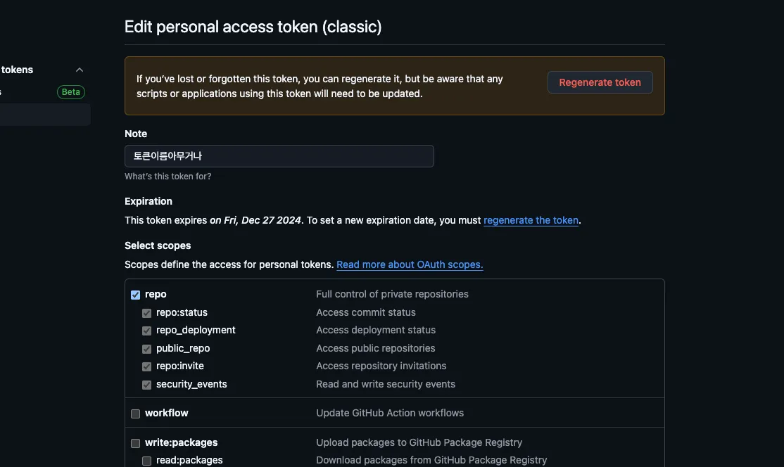 토큰은 Developer Settings 가서 발급받으면 된다.