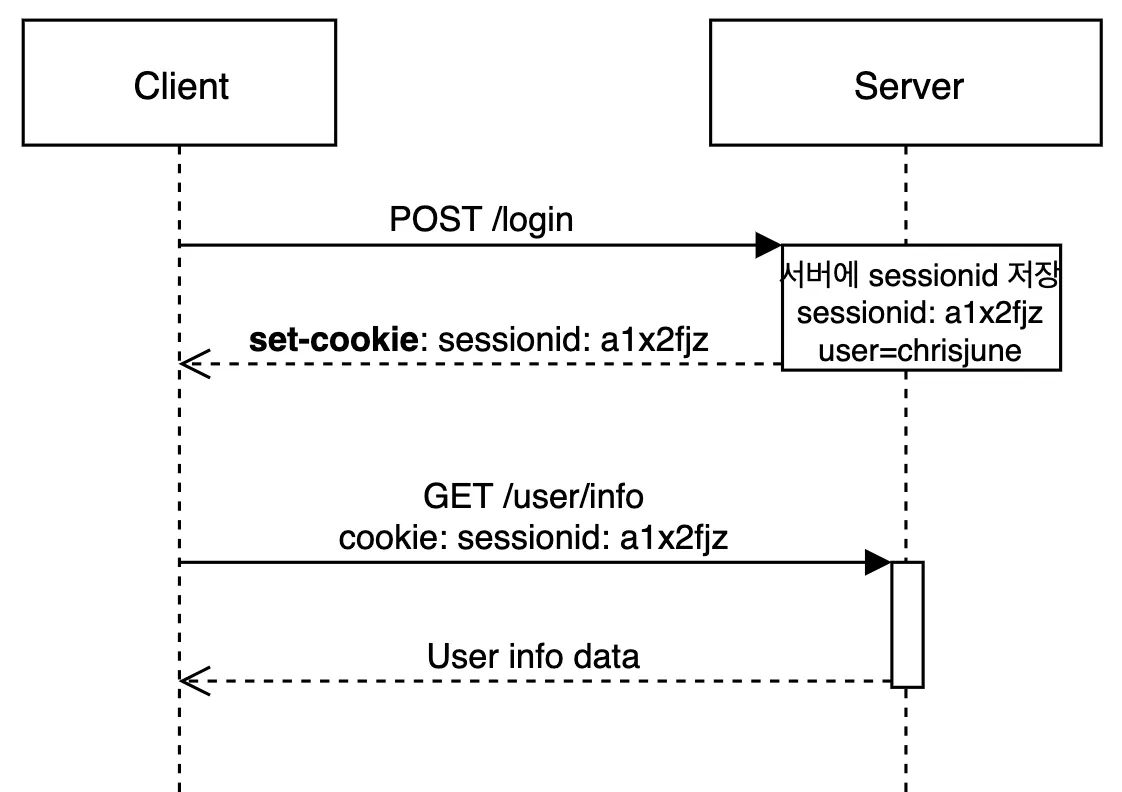 서버에서는 요청 헤더의 세션 ID 값을 저장된 세션저 장소에서 찾아보고 유효한지 확인 후 요청을 처리하고 응답한다.