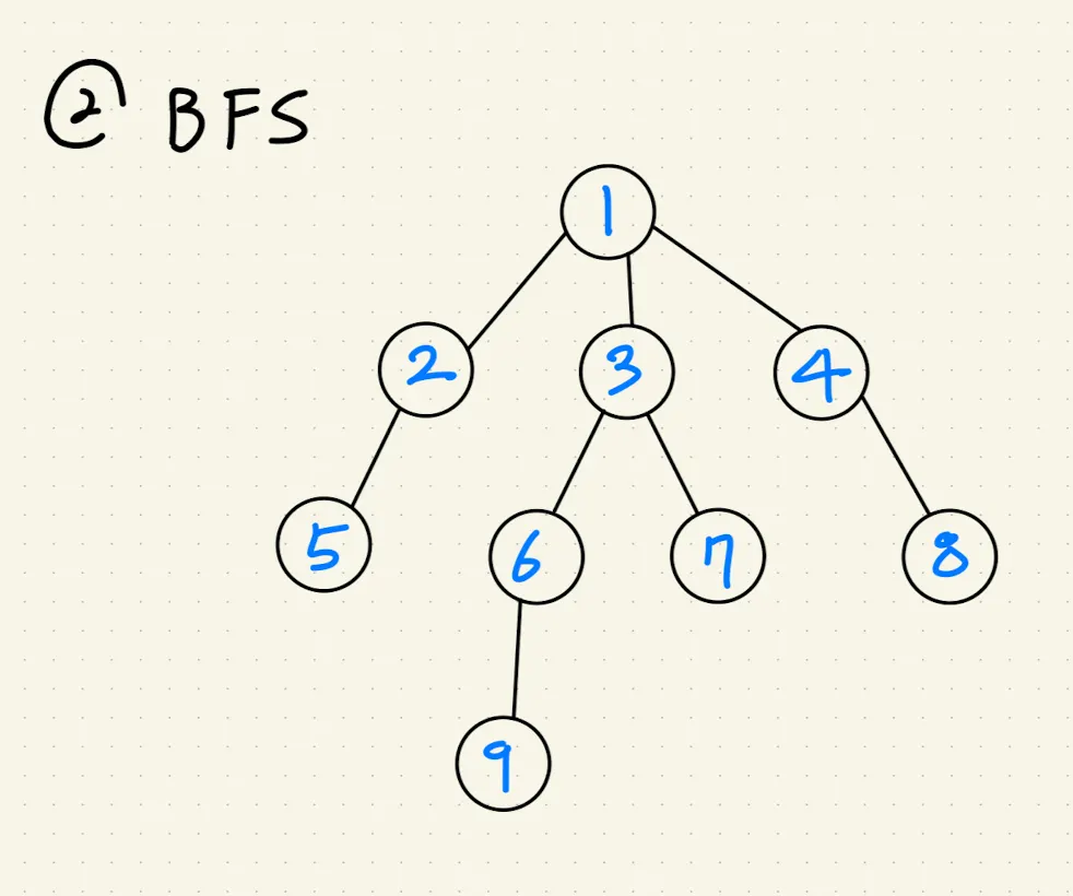 방문 처리한 노드를 큐에서 제거하고, 제거한 노드의 방문하지 않은 모든 인접 노드를 큐에 넣고 방문 처리한다.