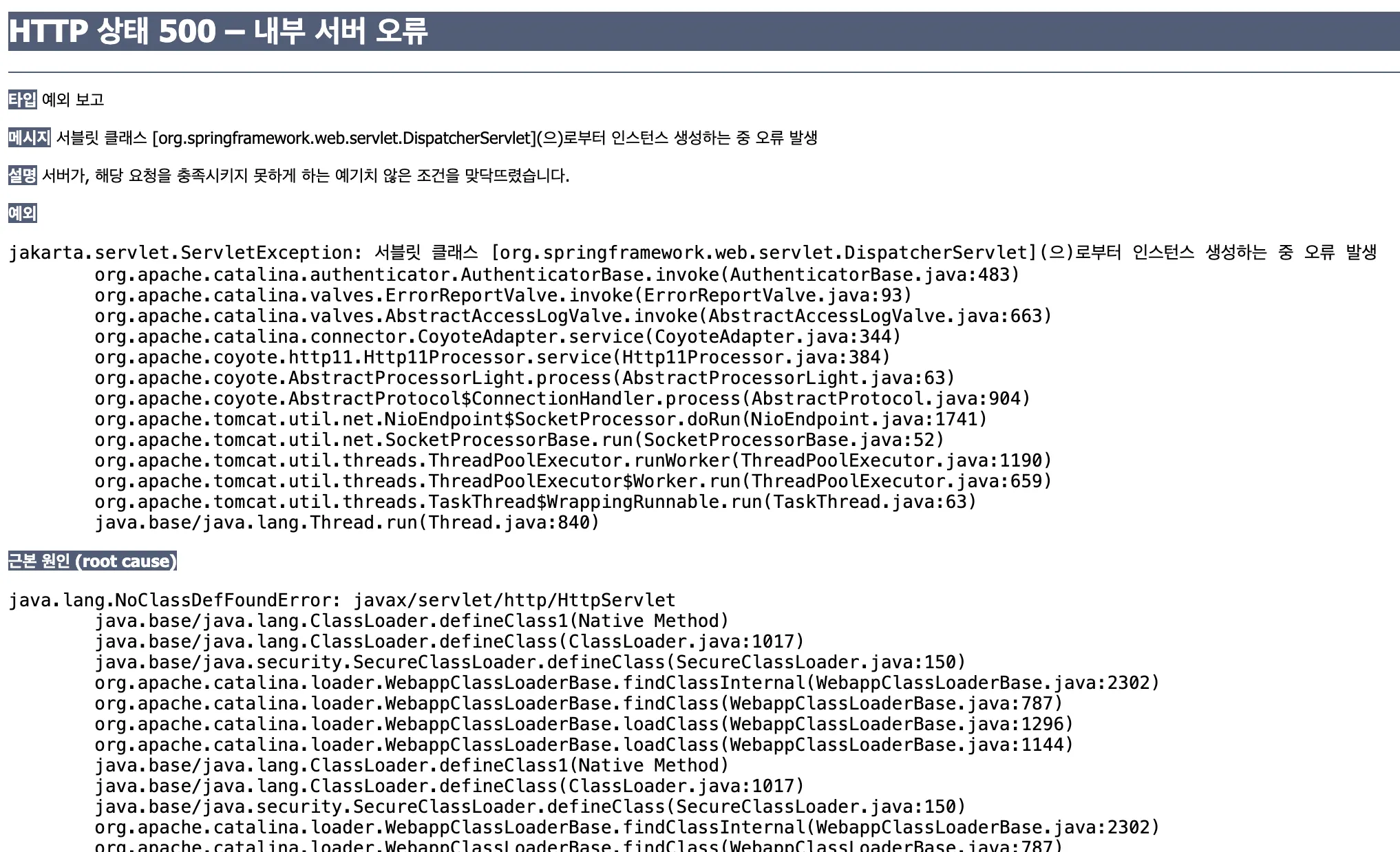 처음에 DispatcherServlet 인식이 안돼서, 아래와 같은 오류가 났었다.