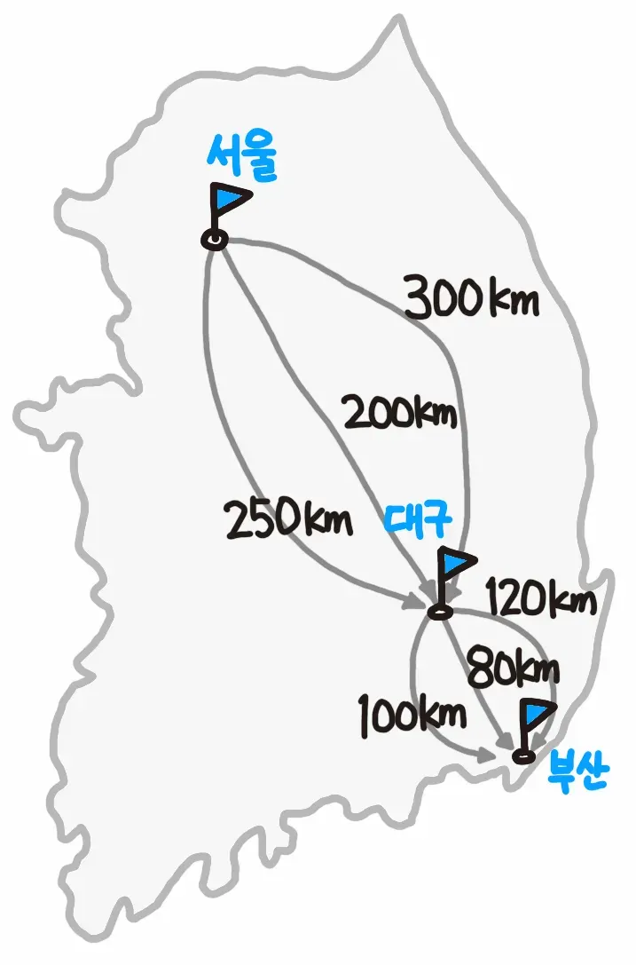 서울에서 부산까지 가는 최단 경로를 찾는 간단한 예를 들어보자. 그림에서 볼 수 있듯이, 서울에서 대구까지 가는 경로는 3가지가 있으며, 대구에서 부산까지도 마찬가지로 3가지 경로가 있다. 서울에서 부산까지 가는 최단 경로는 200km + 80km = 280km이다.