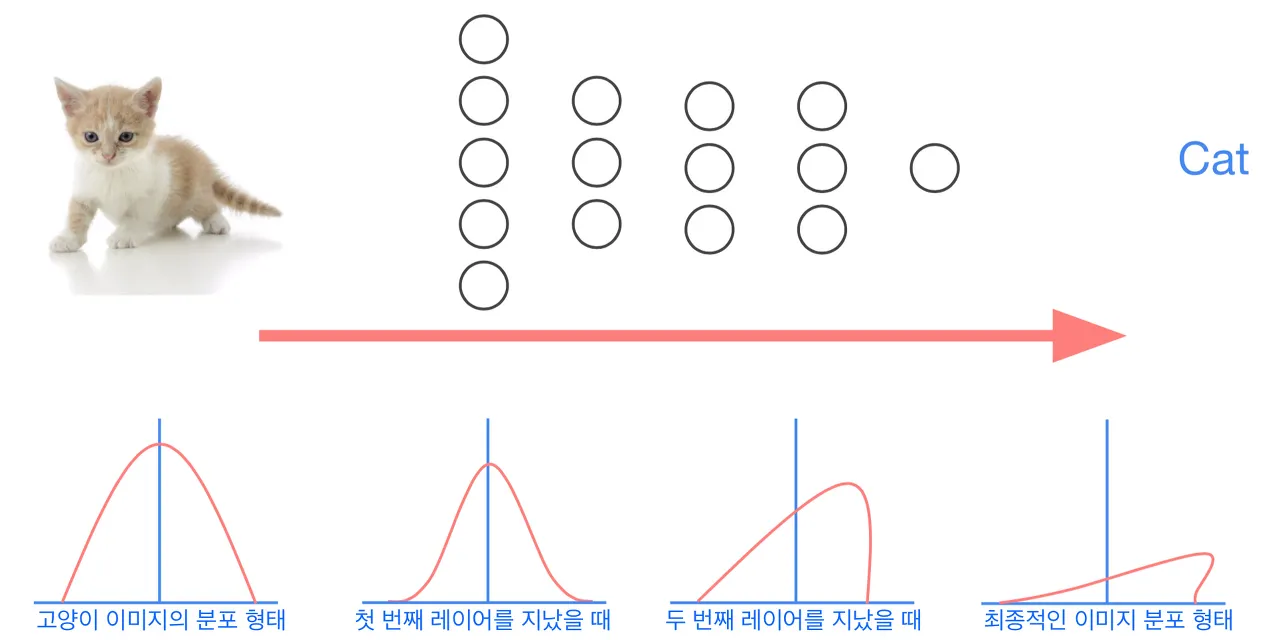 여러 장의 고양이 이미지들은 어떤 분포 형태를 띄고 있으며, forward 되면서 첫 번째 레이어를 통과할 때 covariate shift 문제가 발생한다고 가정해 보자. 1, 2, 3, 4 레이어를 지나면서 분포가 약간씩 변하게 된다. 이러한 현상을 Internal Covariate Shift 라고 한다.