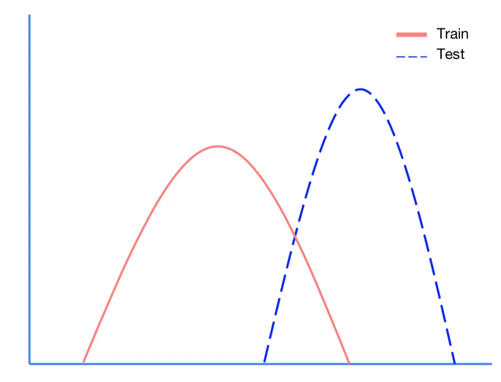 위 그래프처럼 빨간색 그래프가 train set 파란색이 test set이라고 할 때, 학습셋과 검증셋의 분포(distribution)의 차이가 어떤 문제점을 발생시킨 게 Covariate Shift(공변량 변화)의 개념이다. 입력과 출력의 분포가 다르다는 것도 이와 유사한 개념이다.