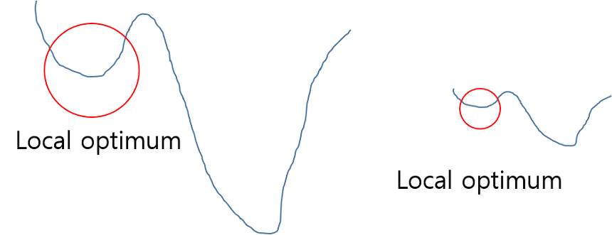 기본적으로 정규화를 하는 이유는 학습을 더 빨리 하기 위해서 or local optimum 문제에 빠지는 가능성을 줄이기 위해서 사용한다. 아래 그림에서 최저점을 찾을 때 그래프를 전체적으로 이해하지 못하여 global optimum 지점을 찾지 못하고 local optimum 에 머물러 있게 되는 문제가 발생하게 된다. 이러한 문제점은 정규화 하여 그래프를 왼쪽에서 오른쪽으로 만들어, local optimum 에 빠질 수 있는 가능성을 낮춰주게 된다.