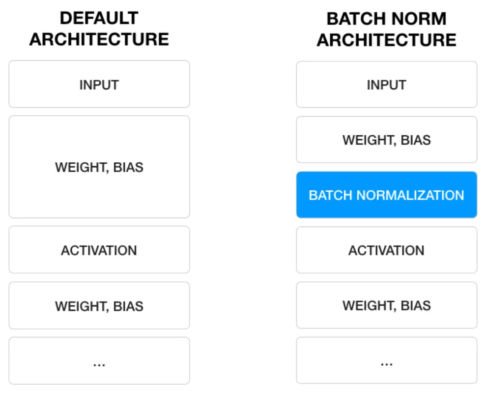 즉, 각 레이어마다 정규화 하는 레이어를 두어, 변형된 분포가 나오지 않도록 조절하게 하는 것이 배치 정규화이다.