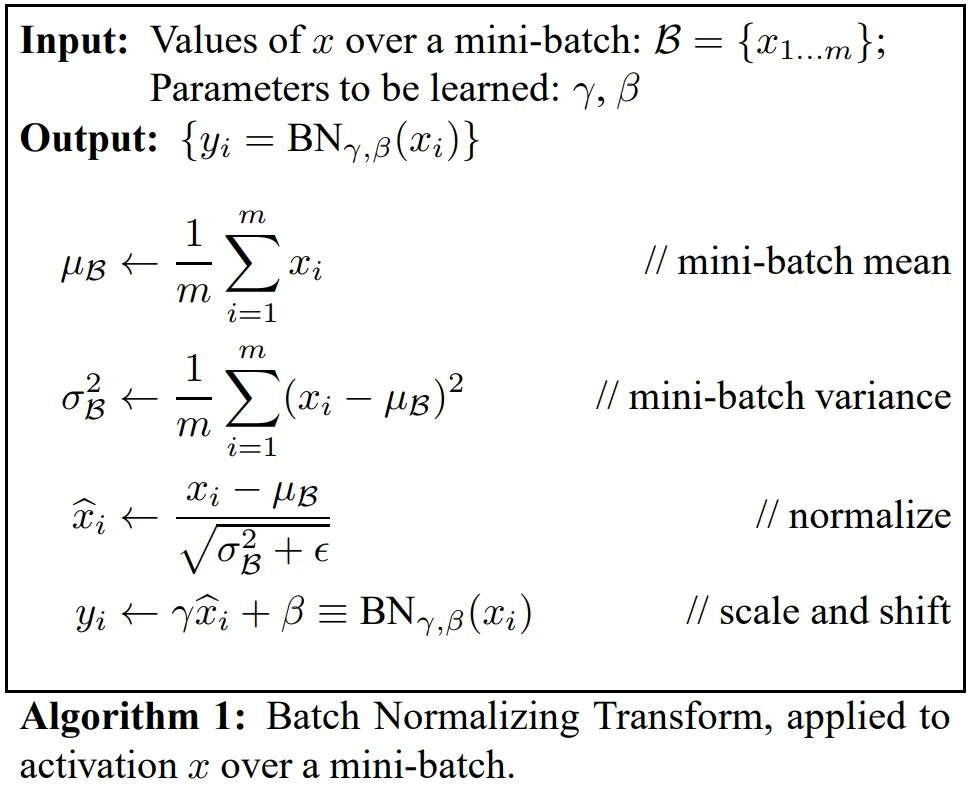 배치 정규화는 간단히 말하자면 미니배치의 평균과 분산을 이용해서 정규화 한 뒤에, scale 및 shift 를 감마() 값, 베타() 값을 통해 실행한다.