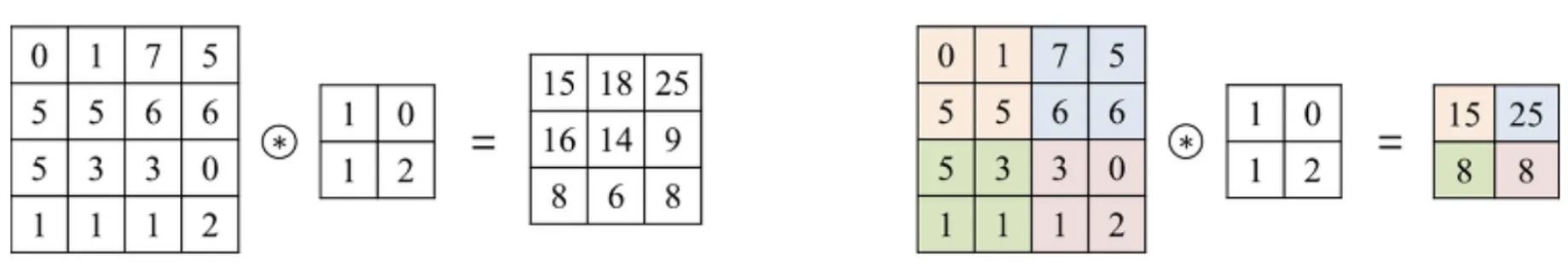 (왼쪽) stride = 1인 경우, (오른쪽) stride = 2인 경우