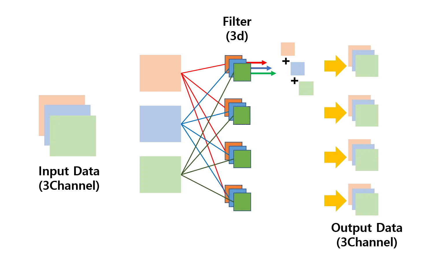 input data의 channel 수와 filter의 channel 수는 같아야 한다.