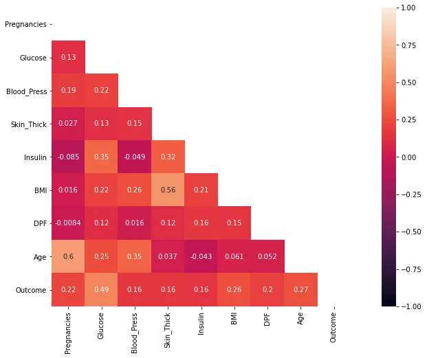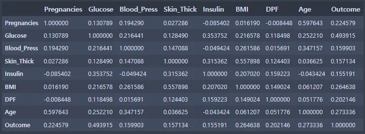 corrMatt = di_data3[['Pregnancies', 'Glucose', 'Blood_Press', 'Skin_Thick', 'Insulin', 'BMI', 'DPF', 'Age', 'Outcome']]