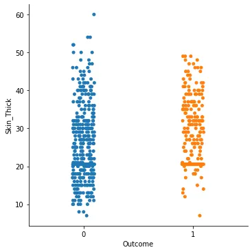 sns.catplot(x = "Outcome", y = "Skin_Thick", data=di_data3)